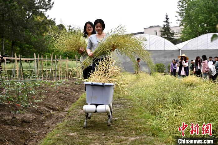 四川成都:高校农场油菜籽迎来丰收 机器人、机器狗助阵帮忙